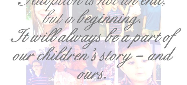 This is, of course, in reference to the idea that we no longer have to wonder about or worry about what the court may decide to do on behalf of our children. We are grateful to have some finality in that regard, and we understand the intention behind the comment, but we can’t help but shake our heads in wonder. You see, even though our days of weekly visits and monthly meetings are behind us for now, “it” is not over. Adoption is not an end, but a beginning. It will always be a part of our children’s story – and ours.